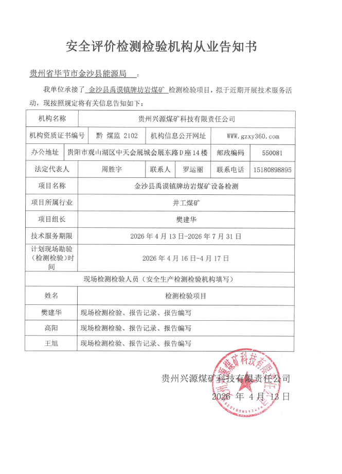 安全评价检测检验机构从业告知书【金沙县禹谟镇牌坊岩煤矿设备检测】