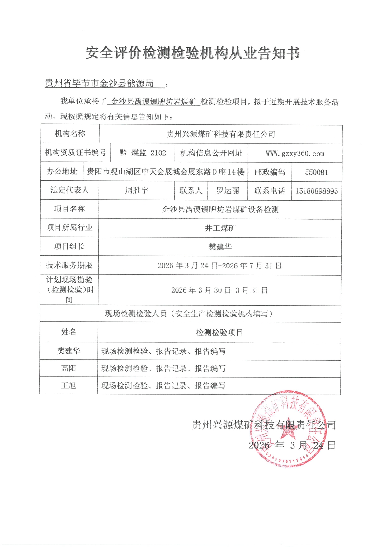 安全评价检测检验机构从业告知书【金沙县禹谟镇牌坊岩煤矿设备检测】